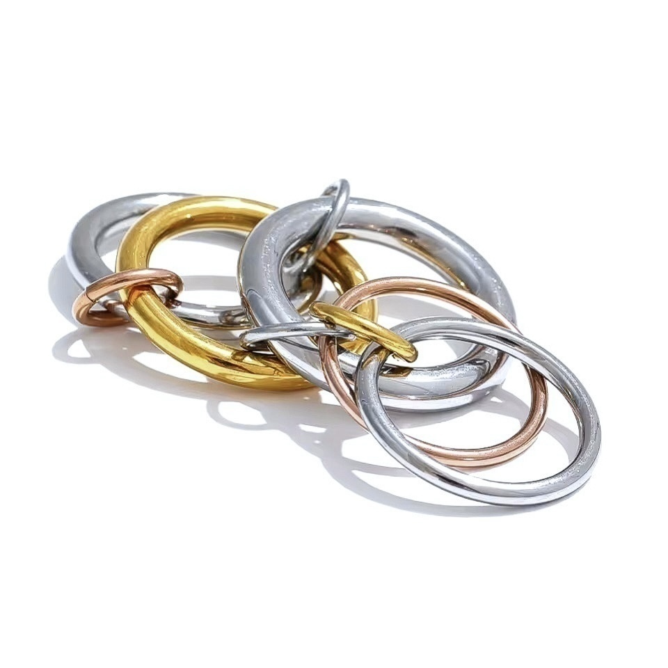 Várias alianças que se conectam para formar um anel cheio de personalidade e nuances. Com as três cores de metal: prata, ouro e rosè, ele sugere o mix perfeito, revelando a beleza que existe nessa diversidade que tanto amamos.