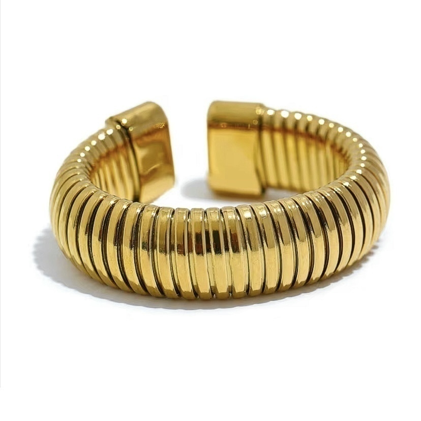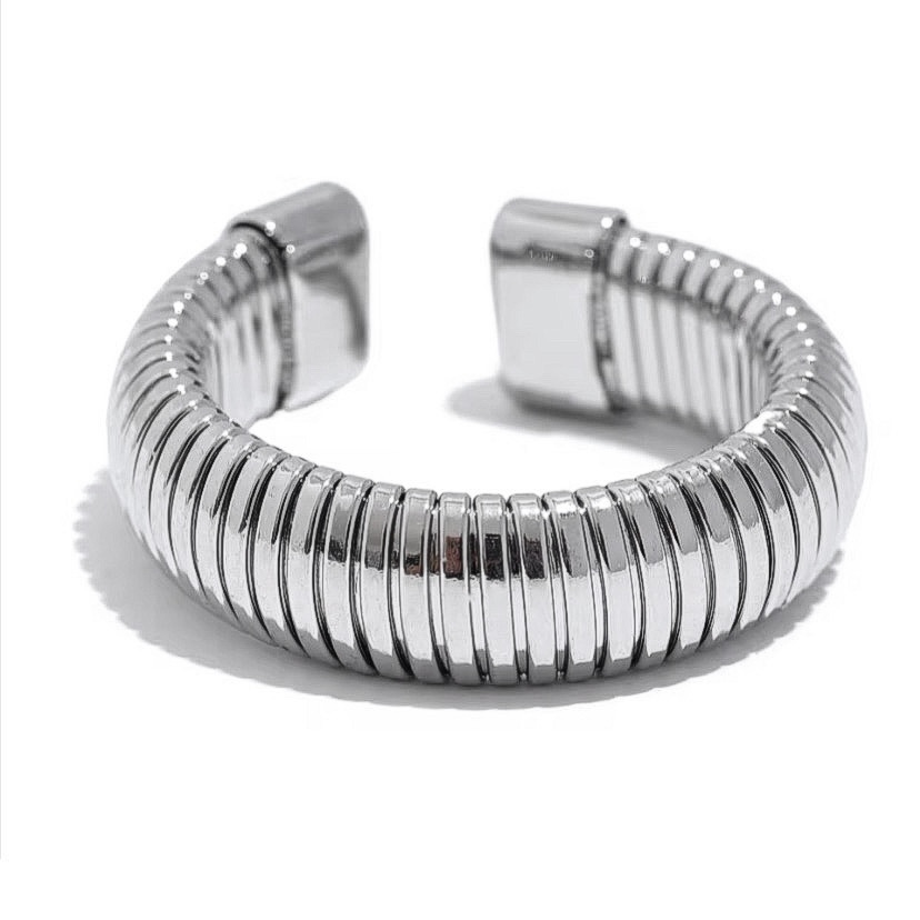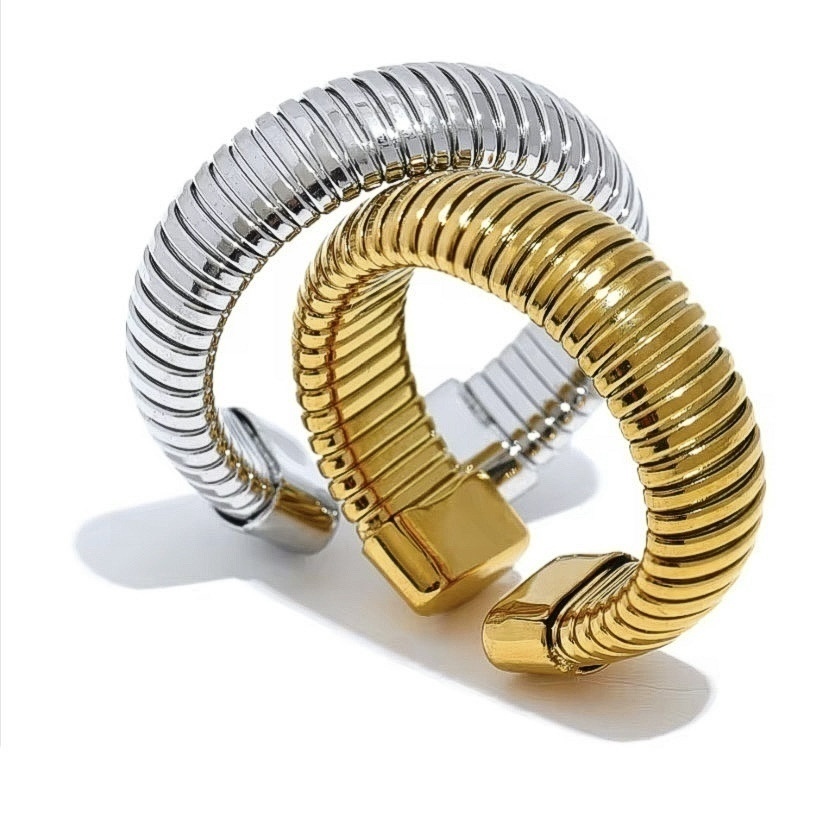 Anel em aço inoxidável, dourado ou prata. Versátil, devido a sua abertura, também pode ser usado como ear clip.