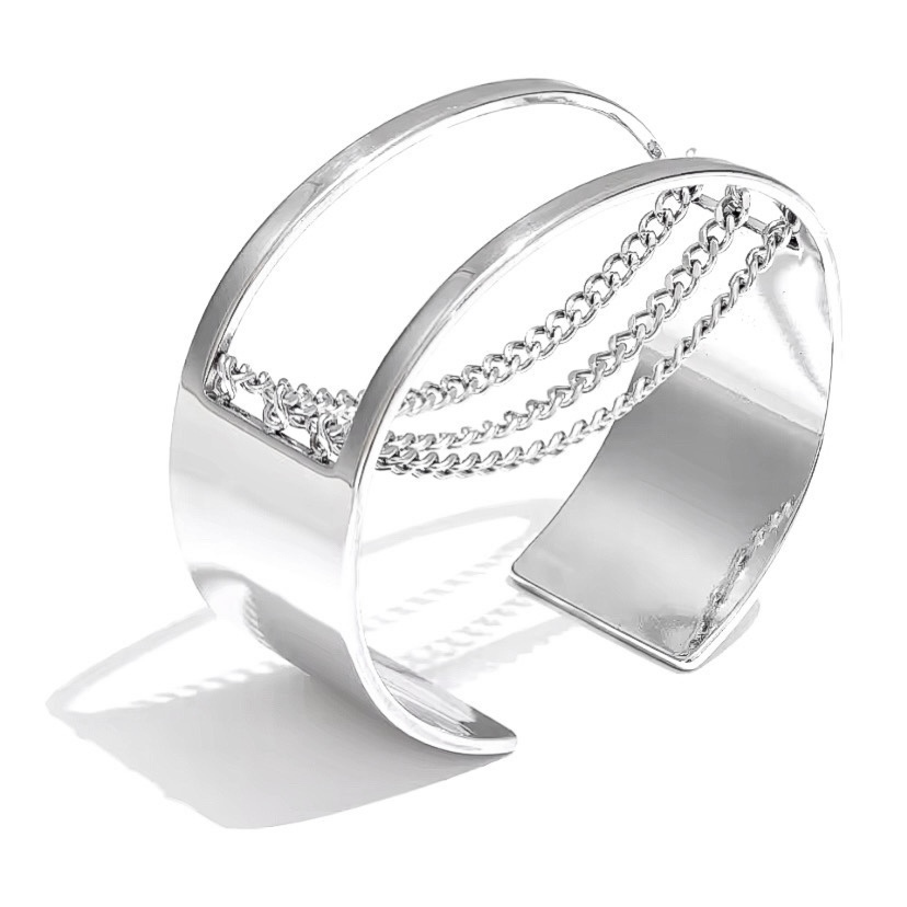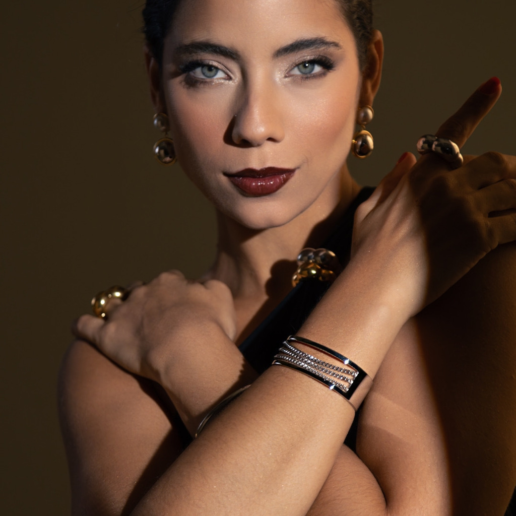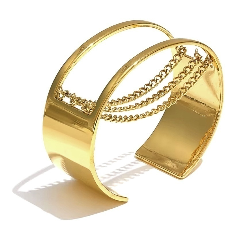 Bracelete rígido em aço inoxidável, dourado ou prata.