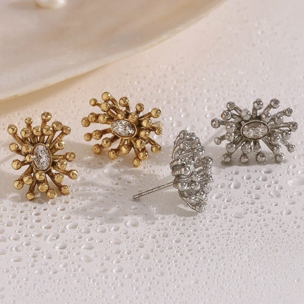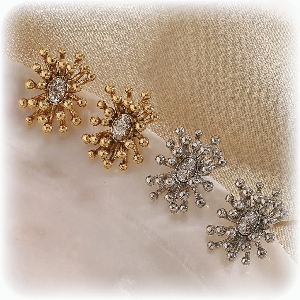 • Brinco em aço inoxidável, dourado ou prata, com pedra de zircônia grande no centro.