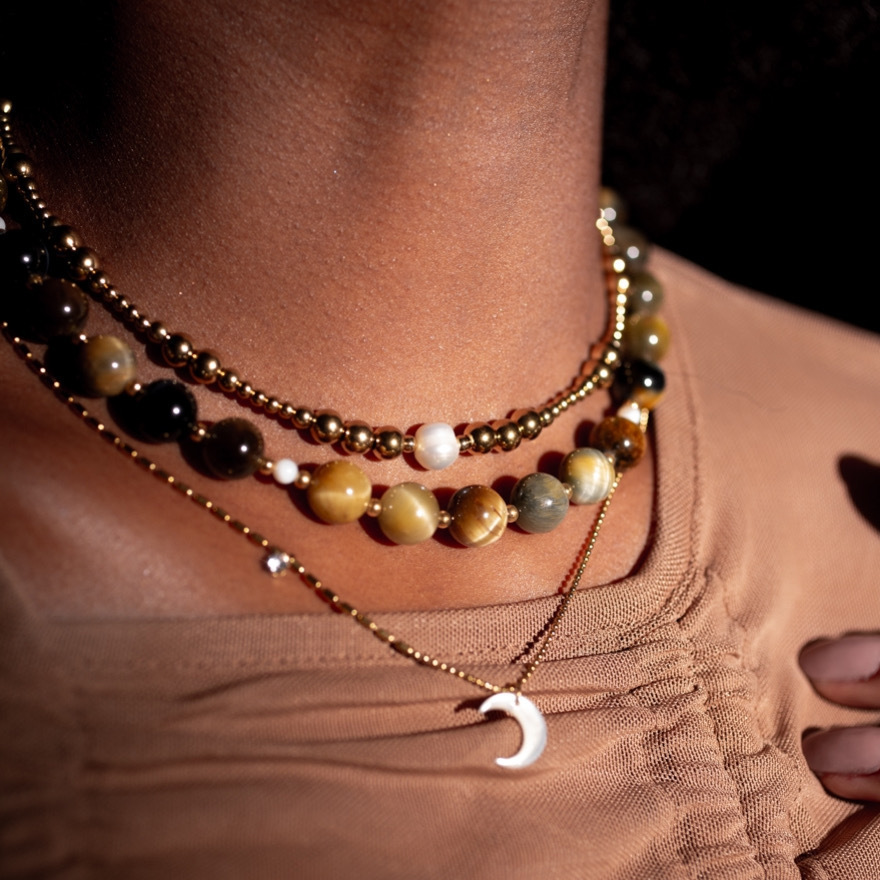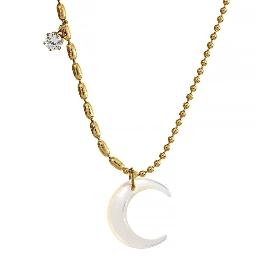 • 100% em aço inoxidável dourado, com pingente de madrepérola natural (lua) e outro de zircônia (estrela).