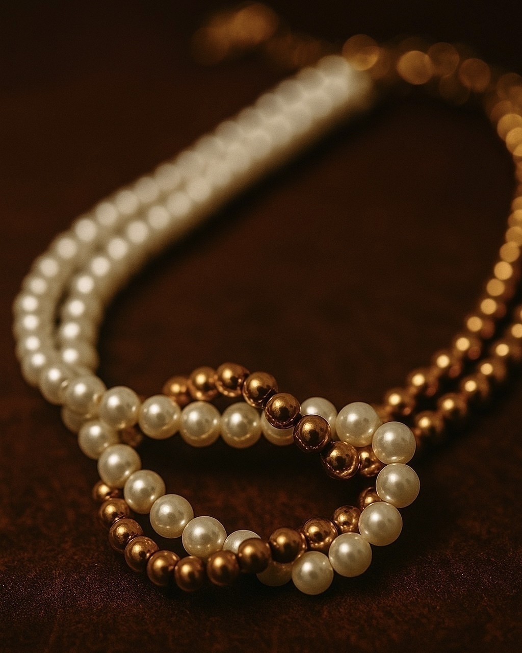 Obs.: colar duplo, arrumado com um "nó de marinheiro", podendo ser desfeito facilmente para serem usados de forma tradicional ou separadamente, colar 2 em 1.