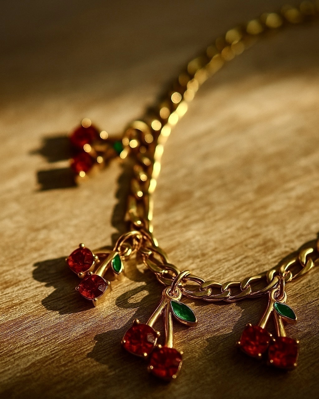 Colar em aço inoxidável, com pingentes de cerejas de pedras Zircônias coloridas: vermelhas e verdes.